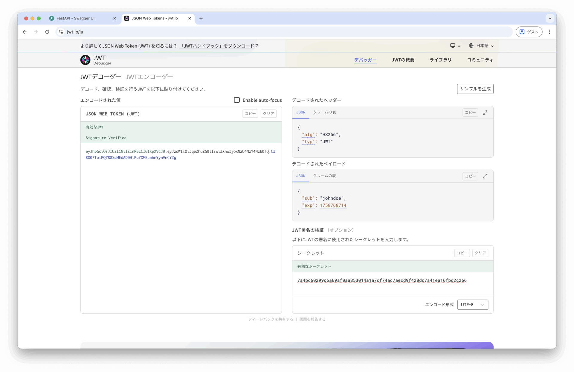 署名アルゴリズム(alg)やトークンの種別(typ)、ユーザー名(sub)や有効期限(exp)の情報が含まれていることが確認できました。