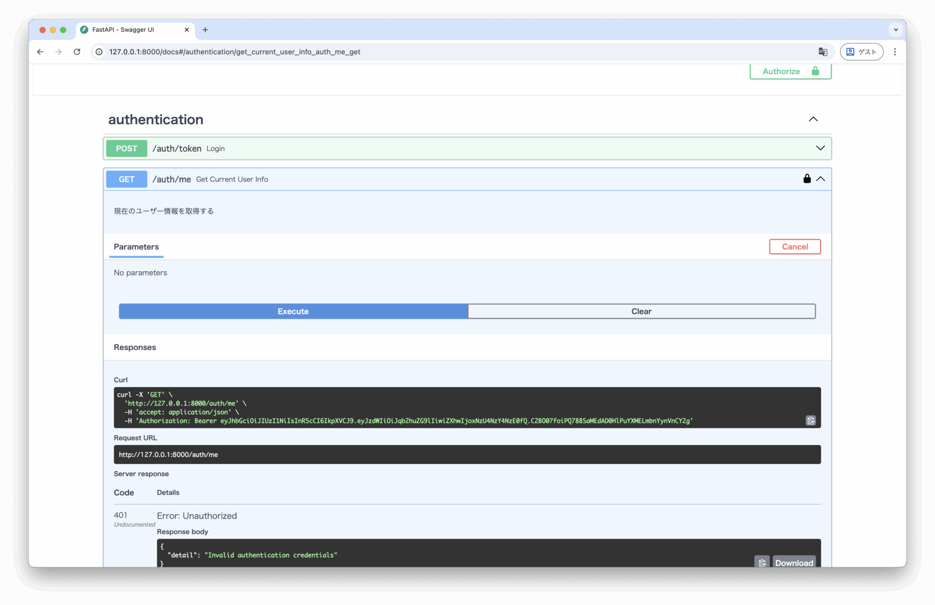 トークンを検証する処理は未実装のため、レスポンスは 401(Unauthorized) で返っています。
