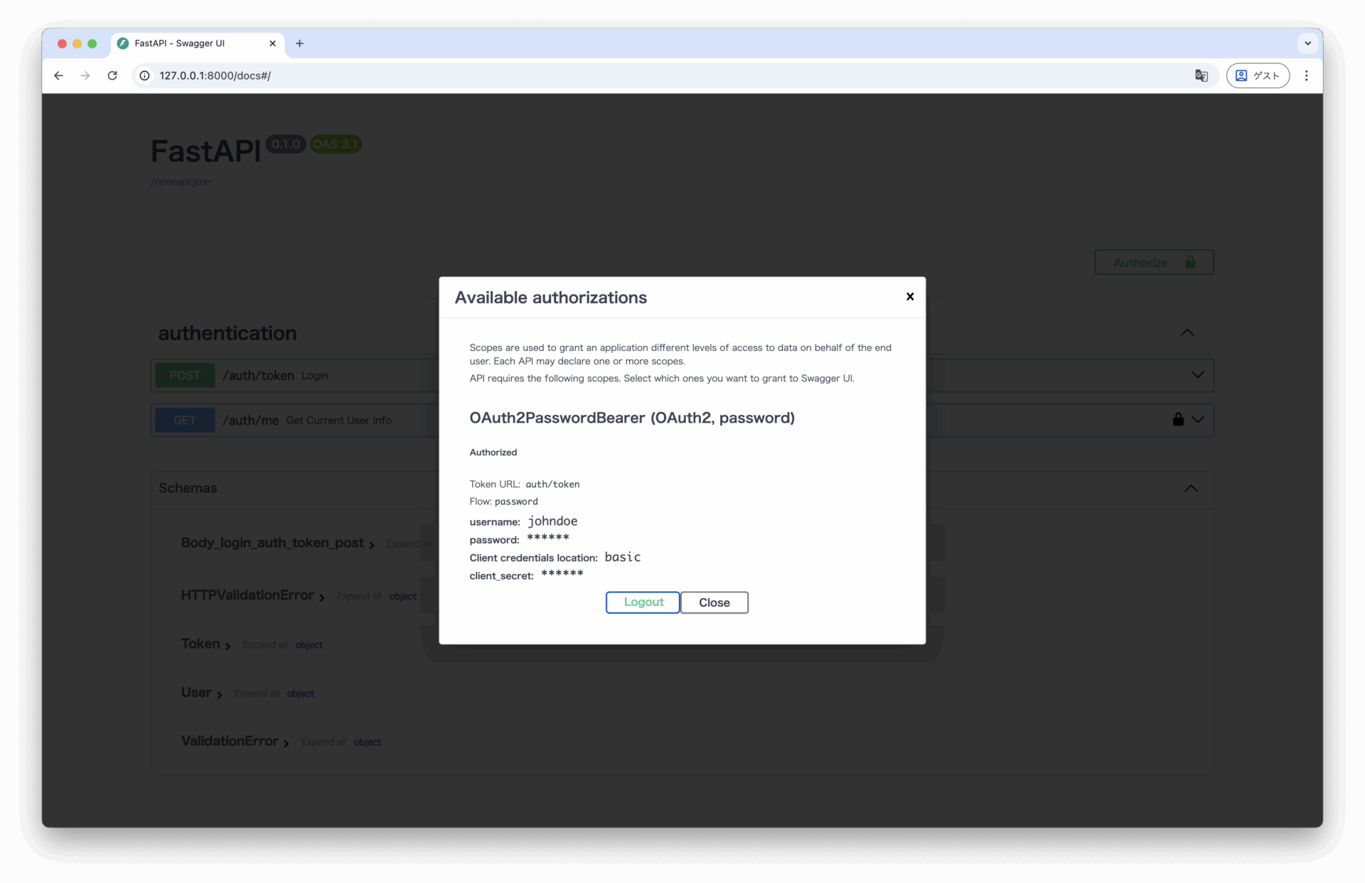 FastAPI の標準機能に加えてハッシュ化ライブラリと JWT ライブラリを使用することで、JWT 形式のアクセストークンを使った認証機能を実装することができました。