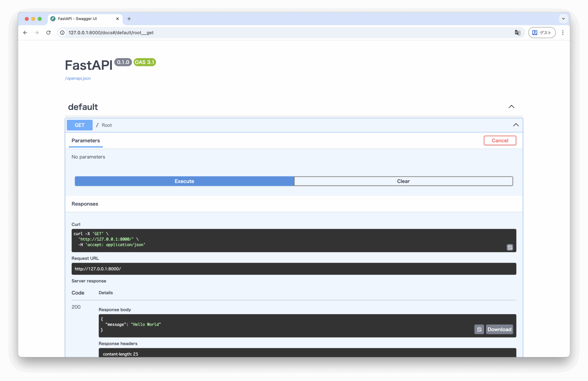 http://127.0.0.1:8000/docs にアクセスし、Swagger UI からエンドポイントを叩いてみます。