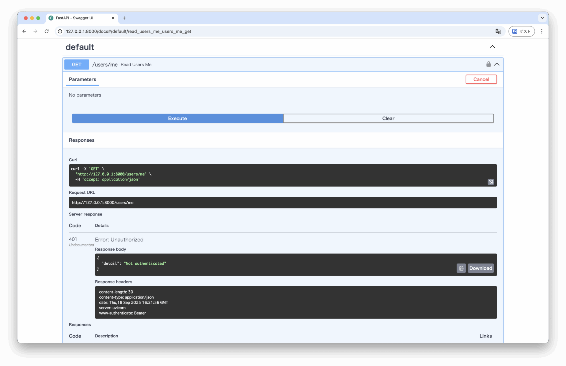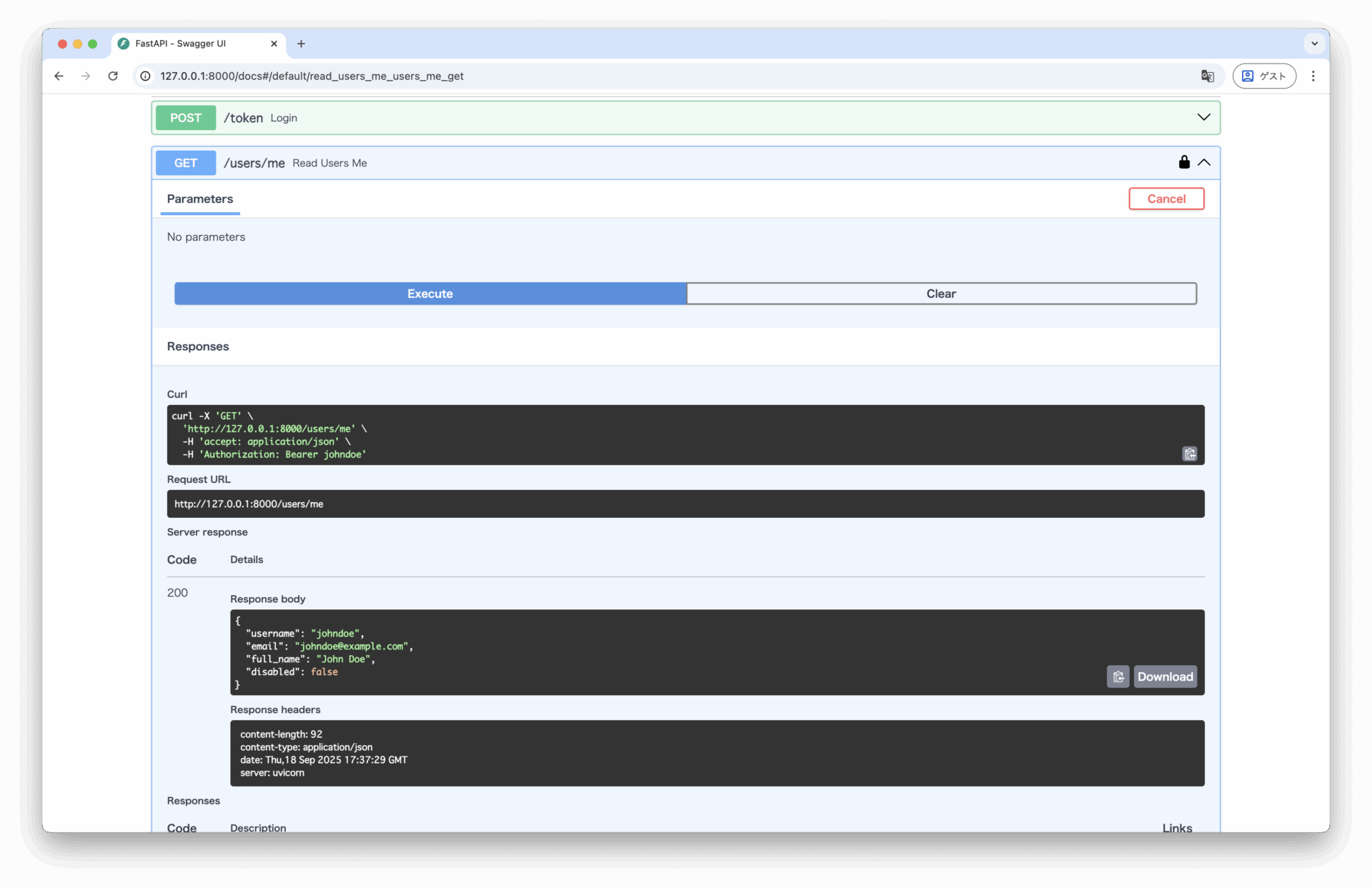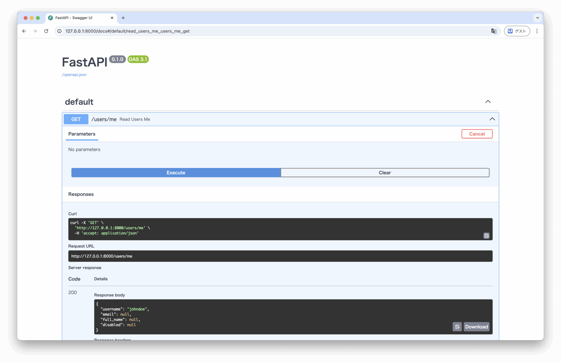 認証が通りました。この状態で GET /users/me を実行してみます。