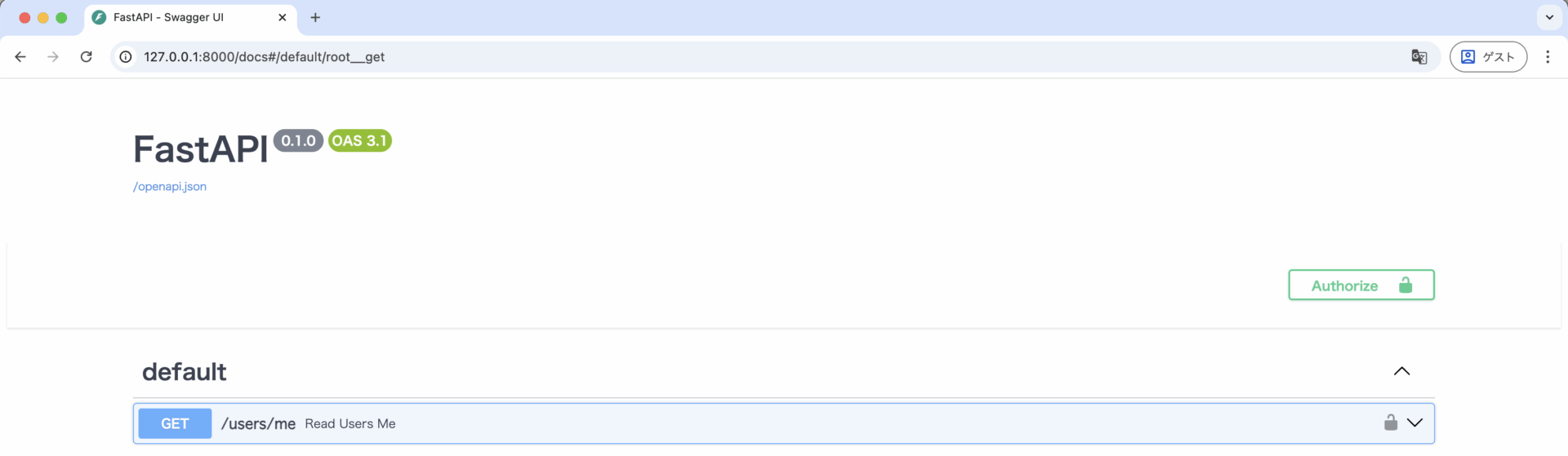 この状態で Swagger UI を開くと、「Authorize」のボタンが追加され、GET /users/me は認証が必要な状態になっている(鍵マークが付いている)ことがわかります。