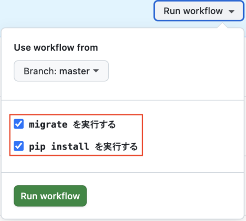 GitHub の画面から必要な処理(今回は pip install と migrate が選択可能)だけを選択してデプロイを実行できます。