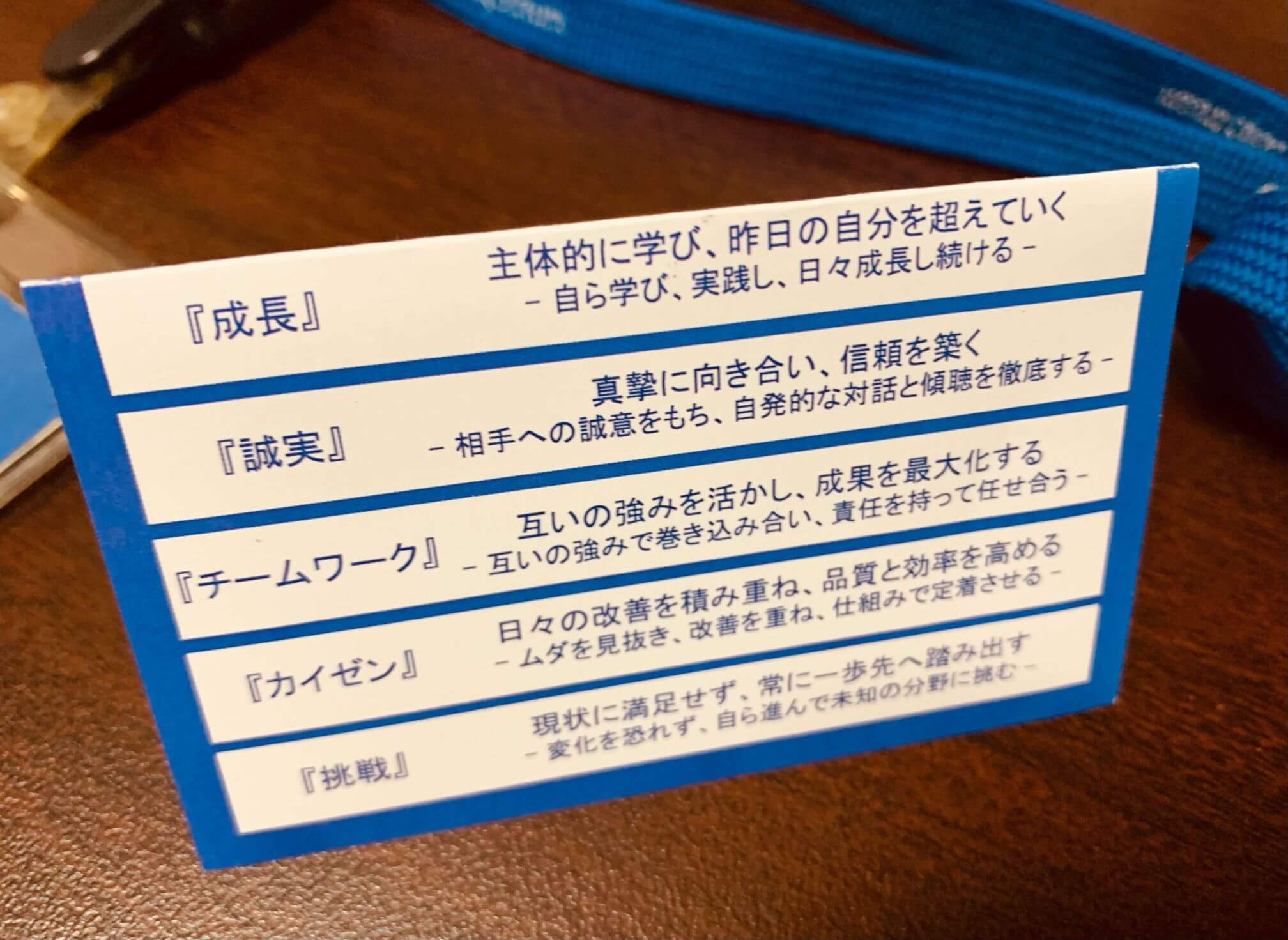 見出しの 成長/誠実/チームワーク/カイゼン/挑戦 だけでも方向性は伝わりますし、本文が加わることで「日々の行動指針」がより具体的になります。